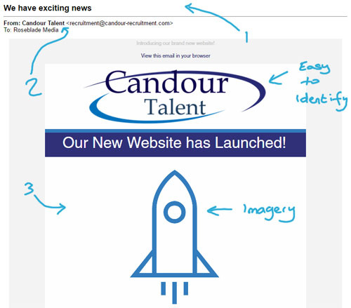 All our emails come from "Roseblade Media" for example. In a similar way, Argos sends theirs from "Argos", Tesco from "Tesco", and, well, you get the idea.